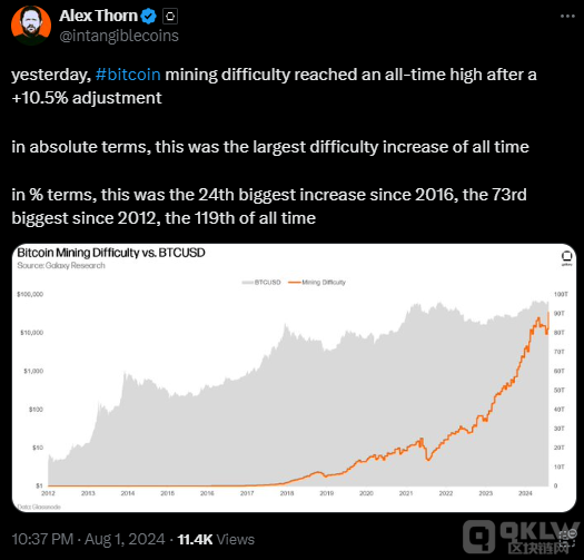 BitcoinMining難度的增加也為市場(chǎng)前景蒙上了一層陰影。Galaxy Digital研究主管Alex Thorn指出,BitcoinMining難度在最近一次調(diào)整中增加了10.5%,達(dá)到歷史新高。這是自2016年以來的第24大增幅,自2012年以來的第73大增幅,有史以來的第119大增幅。