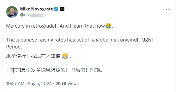 8月5日,Galaxy首席執(zhí)行官Mike Novogratz在X平臺發(fā)文稱,日本加息引發(fā)全球風(fēng)險規(guī)避。這表明短期內(nèi)市場可能會繼續(xù)波動。