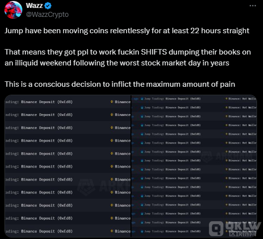 Blockchain研究員“Wazz”表示:“這意味著他們在股市經歷多年來最糟糕的一天后的低流動性周末出售他們的資產,這是一個故意造成最大痛苦的決定。