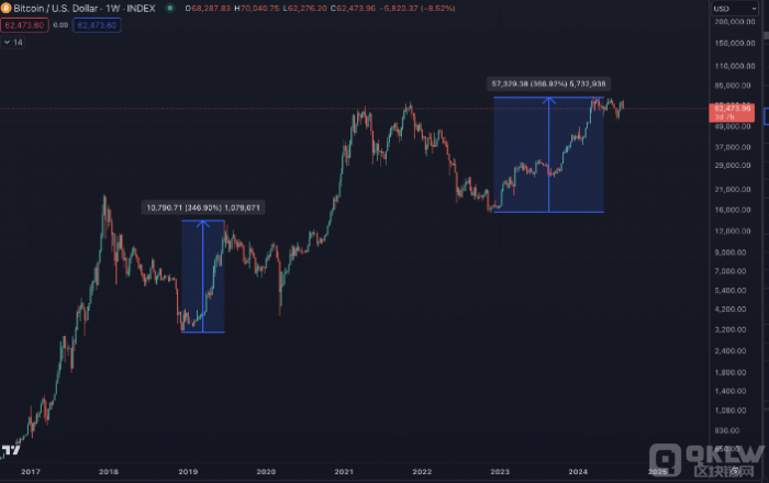 Brandt 在8月5日的X帖子中提到,“本次減半以來BTC的跌幅與2015-2017年減半的牛市周期類似?!?他通過比較減半日期以來的市場調整幅度,發現兩者有著驚人的相似之處。