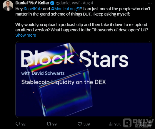 Eminence首席技術官兼XRPL大使Daniel “No” Keller是第一個公開表達失望的人之一。Keller在推文中質問Schwartz和Long:“為什么你們上傳了播客的標準版本,然后將其刪除并重新上傳編輯后的版本?‘數千名開發者’部分到底發生了什么?Ripple和RippleX讓社區感到失望。為什么要假裝一切都很好呢?”