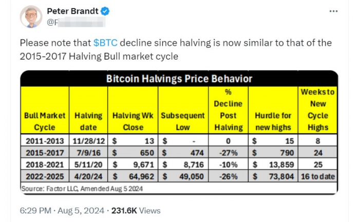 在8月5日的一篇X帖子中,Brandt表示,“自減半以來(lái)的BTC下跌現(xiàn)已類似于2015-2017減半牛市周期。”