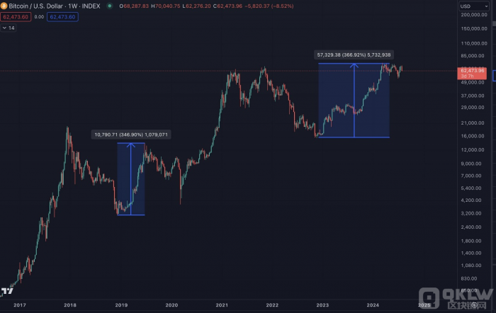 Bitcoin在2016年減半后及2017年牛市前經(jīng)歷了類似幅度的下跌。根據(jù)資深交易員彼得·布蘭特(Peter Brandt)的分析,自2024年4月減半以來(lái),Bitcoin的下跌開始與2016年牛市前的市場(chǎng)走勢(shì)相似。