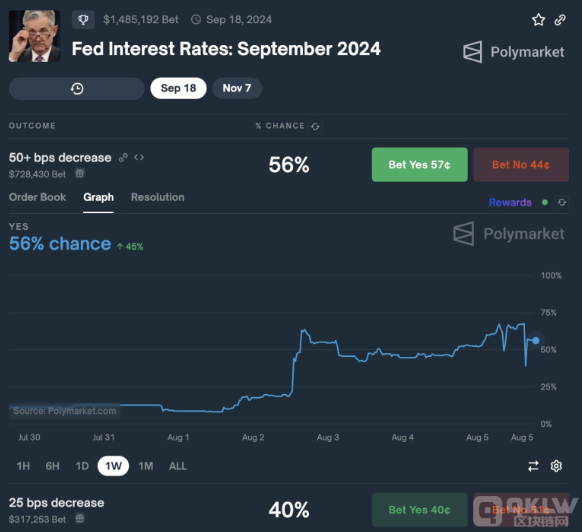 在資本市場動蕩期間,Polymarket用戶發起了“預估美聯儲在2024年9月降息幅度”的賭注。據統計,目前預測美聯儲將降息超過50個基點的概率為56%,而降息25個基點的概率為40%,分別投注了72.8萬美元及31.7萬美元。