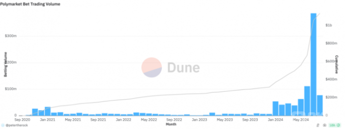 受益于美國大選,Polymarket在7月創下歷史最高交易量,達到3.87億美元,累積用戶數超過4.4萬名。關于美國政治事件的預測,推動了該預測市場的累計交易量至今已突破11.37億美元。