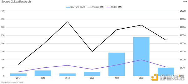2023年新加密風險投資基金成立數量是2020年以來最少的,平均基金規模下降了30%,中位數基金規模下降了45%。