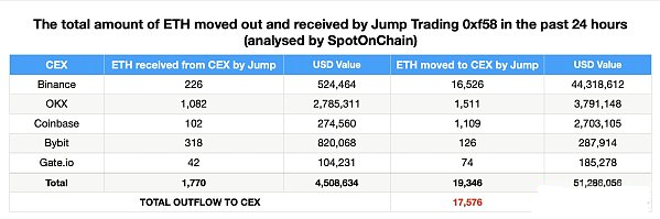 從7月17日開始,Jump Crypto的鏈上錢包地址就出現了大量異常轉賬。例如,某地址于7月17日向Jump Trading地址轉入了價值約3440萬美元的ETH。自7月19日起,該公司開始持續拋售Ethereum,并在7月25日至8月5日期間向CEX轉入了累計2.79億美元的ETH。
