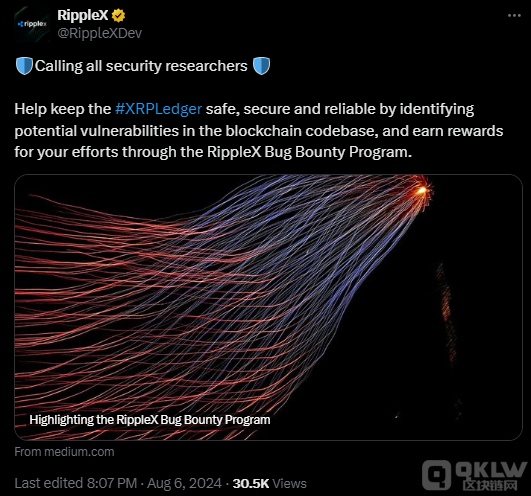 在市場調整的同時,Ripple于周二宣布了一項新的安全研究獎勵計劃,旨在鼓勵研究人員識別其代碼庫中的潛在漏洞。該計劃是RippleX Bug Bounty計劃的一部分,涵蓋了XRP Ledger、Oracle、Lending Protocol、DID等項目的多用途Tokens。