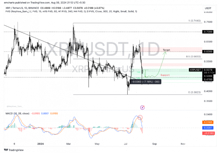 盡管出現了反彈,技術分析顯示,XRP在進一步恢復之前可能會回踩至0.47美元的支撐位。這一支撐位可能會在短期內成為關鍵點,如果跌破該水平,XRP可能會面臨更大的下行壓力。經過流動性清掃后,XRP可能會挑戰0.6美元的心理阻力位。