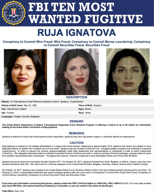 OneCoin 是一個從2014年開始運營的crypto項目,聲稱提供高額回報,但實質(zhì)上卻是一個龐氏騙局。據(jù)悉,該騙局涉及的金額高達(dá)40億美元。2017年,OneCoin 崩潰后,創(chuàng)始人 Ruja Ignatova 失蹤。Ignatova 的最后一次公開露面是在希臘雅典,此后她的行蹤一直不明,這導(dǎo)致美國聯(lián)邦調(diào)查局(FBI)將她列為十大通緝犯之一。