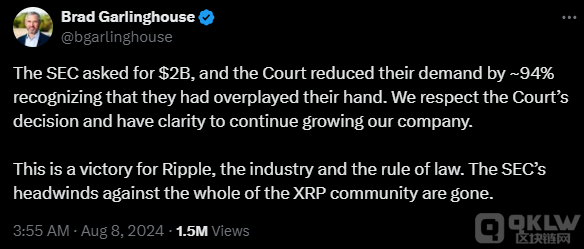 自2020年12月SEC 首次提起訴訟以來,這一裁決似乎標志著 Ripple 與 SEC 的案件接近尾聲。SEC 當時指控 Ripple 使用 XRP 作為未注冊證券進行資金籌集。2023年7月,托雷斯法官裁定 XRP Tokens不應被視為證券,并在2023年撤回了對 Ripple 執行主席 Chris Larsen 的所有指控。