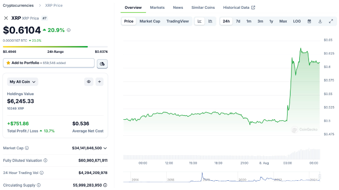 裁決結果公布后,XRP 的價格出現了顯著上漲。XRP 價格在24小時內上漲超過20%,目前交易價格為0.6104美元。