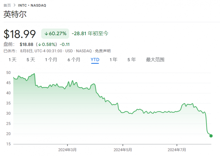 今年受 AI 主題推動,美股市場獲得了持續上漲,英偉達、蘋果、特斯拉等科技巨頭均取得了令人注目的成績。然而,曾經的時代寵兒英特爾今年至今,股價已重摔 60%,撰稿時報 18.99 美元,市值落到 810 億美元。