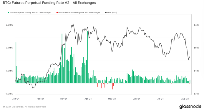 進入2024年,市場顯示出相對穩定的資金費率環境。盡管Bitcoin價格在2024年中期達到了峰值,但隨后的價格回調將其推至55,000美元以下。此期間,資金費率穩定在接近于零的水平,偶爾跌至負數區域。這表明市場在多空頭寸之間達到了平衡,投資者的杠桿作用相對穩定,市場情緒趨于平衡。