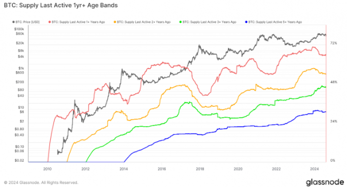 數據顯示,自2024年初以來,Bitcoin中未動的供應比例逐漸下降。這一變化表明,長期持有者可能開始逐步拋售其持有的Bitcoin,這可能會導致市場出現新的拋售壓力。