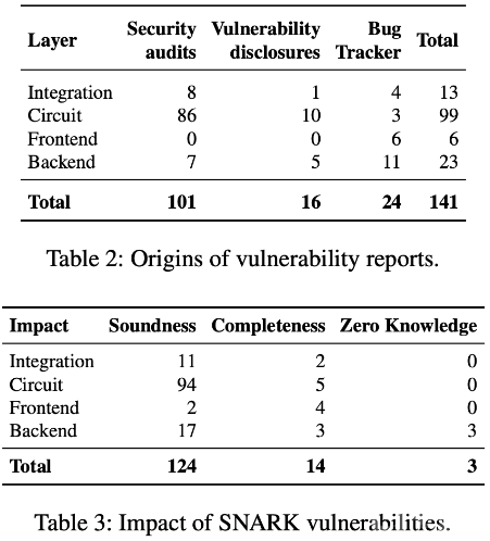 研究顯示,在發(fā)現(xiàn)的95個(gè)影響正確性的漏洞中,4個(gè)則影響系統(tǒng)的完整性。最常見的漏洞源于約束不足,這可能導(dǎo)致測試人員接受無效證明,從而削弱系統(tǒng)的整體安全性。研究還指出,開發(fā)人員面臨的挑戰(zhàn)包括適應(yīng)不同的抽象級別并優(yōu)化電路以提高效率,這直接關(guān)系到SNARK的使用成本。