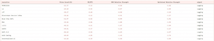 根據Dune數據,Bitcoin在過去90天內的跌幅為4.13%。另外,在監測的11個板塊中,過去90天內均出現下跌。其中,MEME幣板塊跌幅最小,為21.37%,Layer1板塊跌幅為24.1%,顯示出相對抗跌能力。而鏈游和AI板塊跌幅最嚴重,分別下跌了60.69%和63.6%。