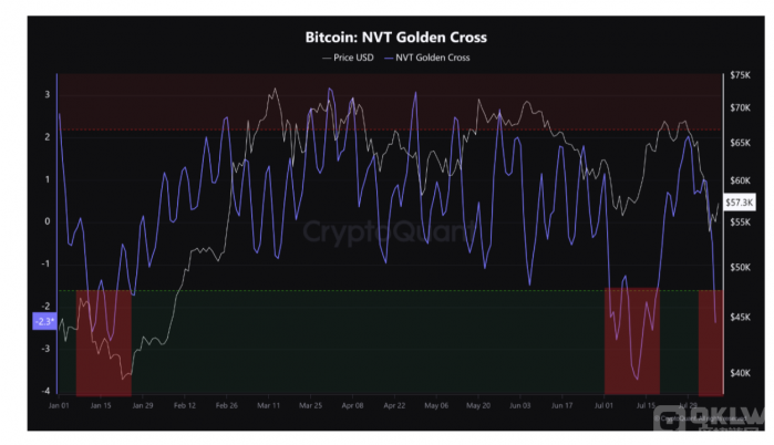 另外,根據鏈上分析平臺CryptoQuant 8月8日的最新研究,Bitcoin在2024年已經第三次發出“局部底部”信號,市場可能即將迎來反彈。該研究指出,網絡價值與交易量黃金交叉(NVT-GC)指標顯示出看漲趨勢,暗示Bitcoin價格有望回升。