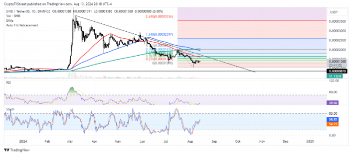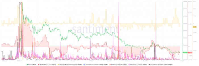 盡管近期市場出現波動,8月5日的市場崩盤對SHIB投資者的影響相對有限。在此期間,凈流入和流通中的不活躍Tokens并未顯示出典型的交易峰值。此外,SHIB的加權情緒已降至-0.7,顯示出投資者情緒較為低迷,30天市值與當前價值(MVRV)比率為-11.9%,表明大多數投資者平均損失約11%。