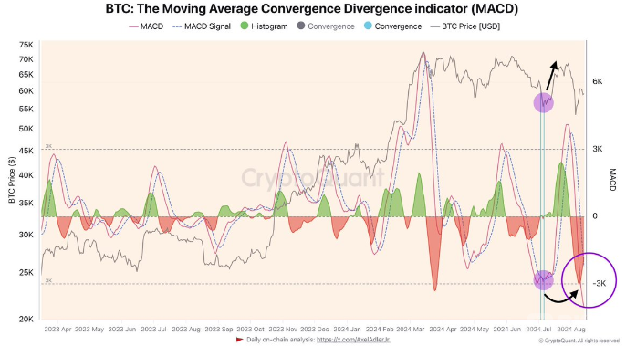 與此同時,Bitcoin分析師Exel Adler Jr.提到,日線圖上的移動平均背離收斂(MACD)指標出現看漲信號,可能會進一步刺激買方成交量。MACD的看漲交叉通常預示著價格的上漲,投資者對此保持密切關注。