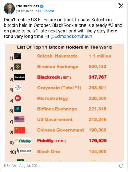 Balchunas 認為,ETF 最快將在10月份超越中本聰的Bitcoin數量。他指出,僅貝萊德(BlackRock)一個機構就已成為排名第三的 ETF,預計將在明年年底成為第一。