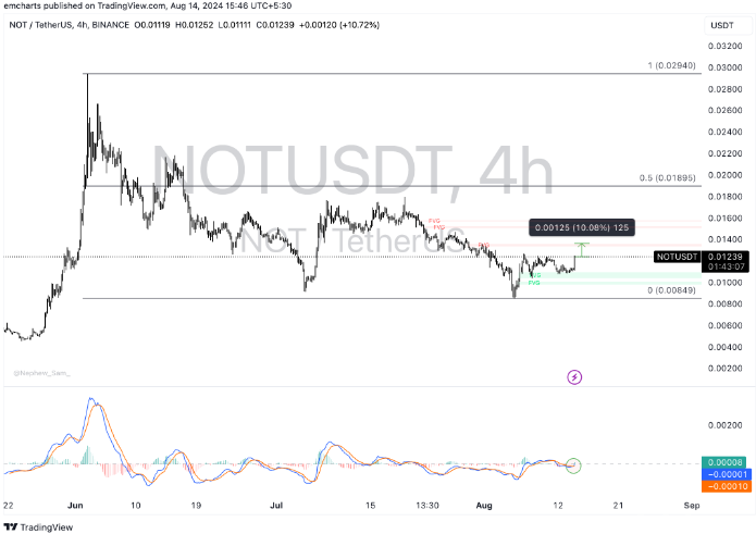 Notcoin在經(jīng)歷了數(shù)月的下行趨勢后,周三觸及0.0129美元的局部高點,市場分析師預(yù)測其目標(biāo)價為0.01362美元,漲幅約為10%。根據(jù)移動平均收斂背離(MACD)指標(biāo)的分析,MACD線已穿過信號線,這被視為看漲信號,可能驅(qū)動NOT價格進(jìn)一步上漲。