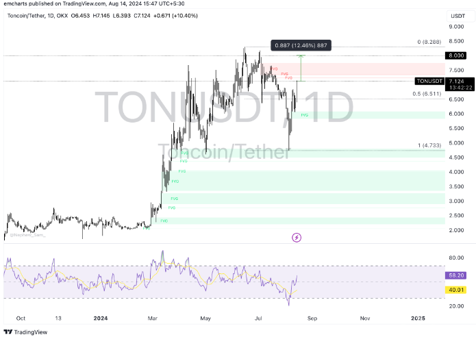 在持續(xù)看漲的情況下,Toncoin可能會在6,083美元的公允價值缺口區(qū)域找到支撐,當(dāng)前相對強弱指數(shù)(RSI)為58.2。
