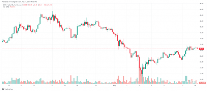 自2023年3月推出以來,ORDI在加密市場中引起了廣泛關(guān)注。ORDI的價格通常依賴于Bitcoin的波動,尤其是在BTC價格創(chuàng)下歷史新高時,ORDI也曾一度飆升至96.31美元。當(dāng)前ORDI的價格為30.58美元,在過去24小時內(nèi)小幅下跌0.1%。