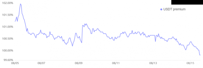 8月15日,美元兌USDT在cn的交易價格比原價低0.2%,表明crypto需求減少。這與8月6日相比有顯著變化,當時交易員為USDT支付了2%的溢價,創下該指標三個月來的最低水平。