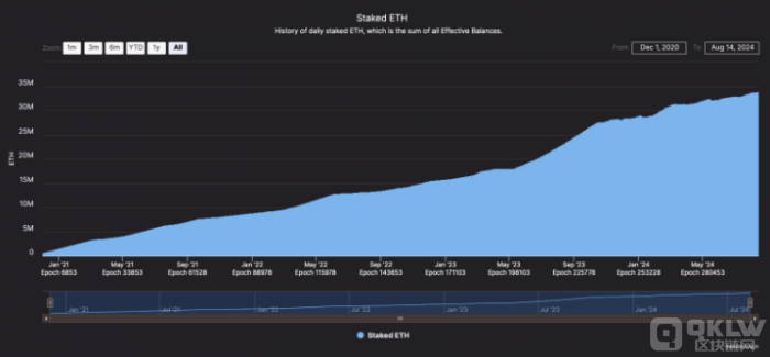 目前,約3390萬ETH被質押在網絡中,為持有者帶來了豐厚的獎勵。這種質押行為不僅增加了供應量,還促使參與者將質押獎勵重新投入網絡,形成了良性循環。
