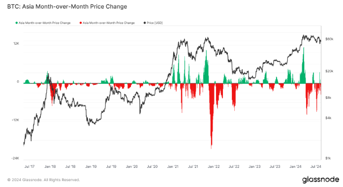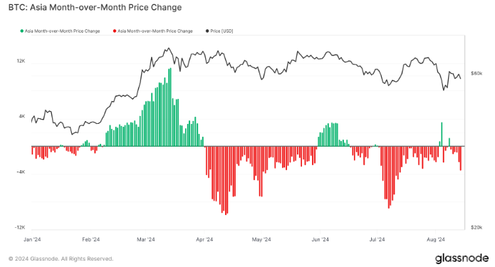 在2024年4月的Bitcoin減半事件之后,Bitcoin在亞洲市場的價格表現出現了顯著的波動。在減半之前,Bitcoin在亞洲交易時段曾出現積極的價格變動,并在3月份達到高峰。從4月中旬開始,這一上升趨勢迅速逆轉,導致連續月度負收益的出現。