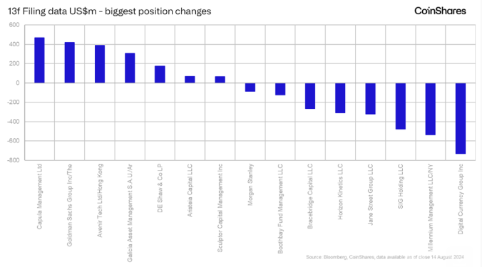 CoinShares的數據還顯示,Capula自3月以來購買了約4.7億美元的BitcoinETF股票,而高盛和Avenir分別購買了4.19億美元和3.88億美元的股票。此外,Galacia Asset Management和DE Shaw分別購買了3.07億美元和1.74億美元的股票。