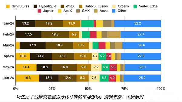市場競爭的加劇也推動了鏈上衍生品的發展。雖然dYdX在2024年上半年仍然是市場的領導者,但面臨著來自SynFutures、Hyperliquid和RabbitX等新興協議的激烈競爭。這些新興平臺通過專注于產品開發和用戶獲取,繞過了復雜的Tokens結構,實現了顯著的增長。