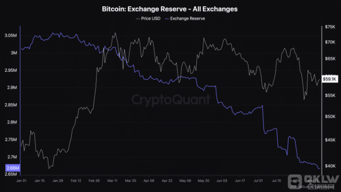 盡管價格在短期內保持穩定,Bitcoin的需求卻在不斷增加。CryptoQuant的數據顯示,到2024年,Bitcoin的交易儲備將顯著減少,表明市場正在經歷供應緊張。當需求上升而供應減少時,通常會推高價格。