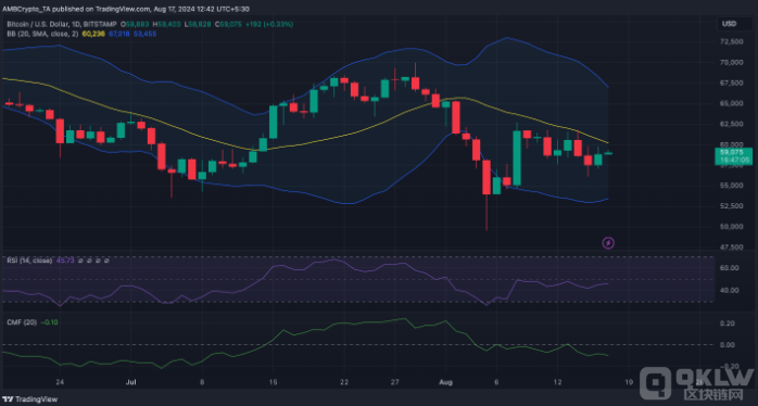 從技術分析的角度來看,Bitcoin的布林線顯示出其即將測試20日簡單移動平均線(SMA)的阻力位。此外,相對強弱指數(RSI)的上升表明,Bitcoin可能會突破20日移動平均線。柴金資金流向(CMF)指標的下滑則顯示出一定的看跌情緒。