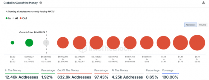 CoinMarketCap的數據顯示,截至撰寫本文時,MATIC的價格已跌至0.4美元,市值降至37億美元。這使其在crypto市場中排名第28位。IntoTheBlock的數據進一步顯示,由于價格的大幅下跌,當前僅有2%的MATIC投資者仍處于盈利狀態。