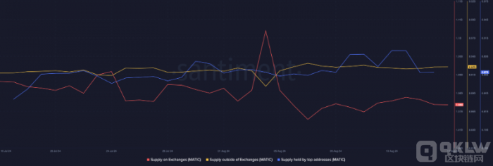 盡管價格和質押量的數據顯示了市場的疲軟,但在過去30天內,MATIC在交易所的供應量略有減少,這表明一些投資者可能正在考慮增持。此外,頂級地址持有的供應量有所增加,暗示鯨魚投資者對MATIC的未來價格上漲持樂觀態度。