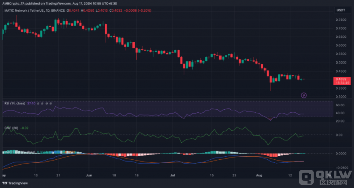 在技術指標方面,MATIC的每日價格圖表顯示了MACD的看漲交叉,同時蔡金資金流向(CMF)也呈上升趨勢,正在向中性線移動。這兩個指標表明,MATIC可能會出現價格反彈。相對強弱指數(RSI)的持平狀態表明,價格的上漲可能不會立刻發生。