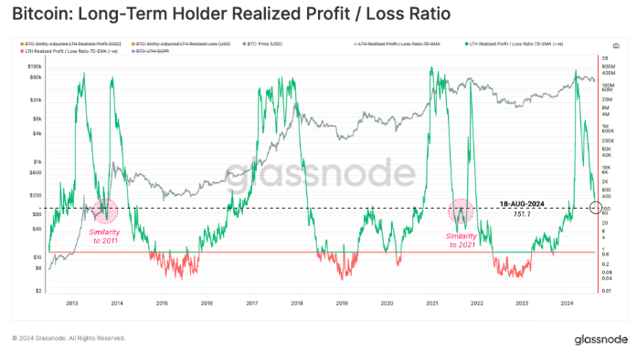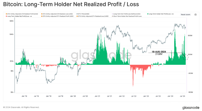 根據Glassnode的最新報告,Bitcoin的長期持有者在當前橫盤走勢中每天仍保持約1.38億美元的利潤。這表明市場上仍有大量資金流入,以吸收拋售壓力,從而在波動的市場中維持Bitcoin價格的相對穩定。