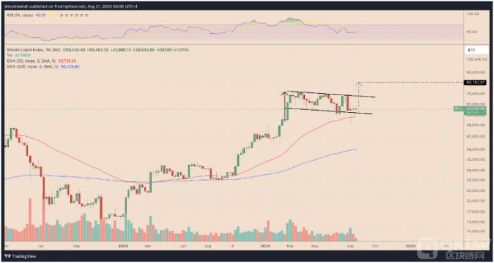 從技術角度來看,Bitcoin的價格走勢呈現出牛旗形態,自3月份以來一直在下降平行通道中修正。若Bitcoin價格突破這一形態的上方趨勢線,則有可能進一步上漲,目標價位可能達到80,000美元。
