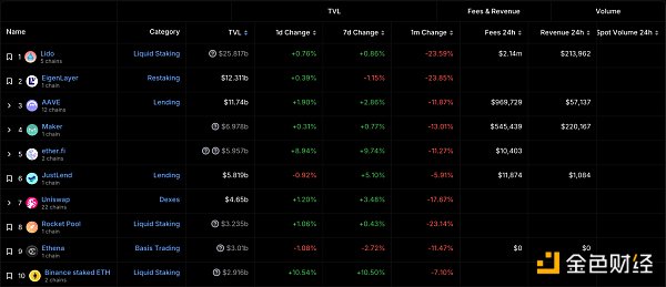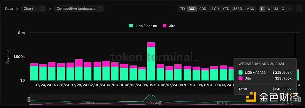 最新數(shù)據(jù)顯示,Lido目前占據(jù)流動性質(zhì)押賽道近70%的份額(下圖1),在收入層面,Lido占據(jù)近80%的賽道收入(下圖2),Lido依靠著先發(fā)優(yōu)勢保持領(lǐng)先地位,但由于與ETH的高度相關(guān)性,與去年同期相比幣價(jià)仍回調(diào)31.2%,DeFi整體表現(xiàn)與ETH高度綁定。