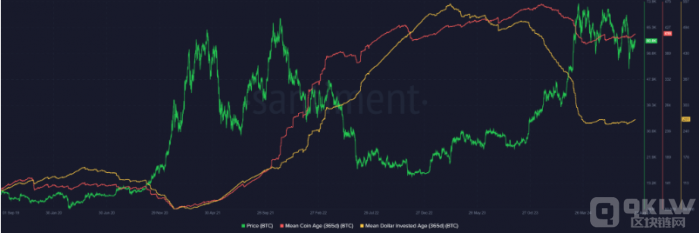 整體來看,平均幣齡在2月和3月急劇下降后開始緩慢上升,價格的快速上漲帶來了獲利了結和拋售壓力。如果這種上升趨勢持續,將表明整個Bitcoin網絡的積累。