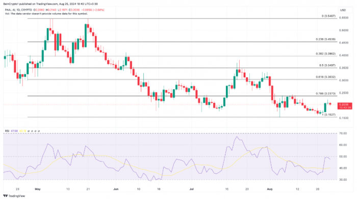 PAAL AI是TG的旗艦Tokens之一,其價格走勢可能與Notcoin類似。在日線圖上,PAAL曾試圖達到0.23美元。這一事件導致價格受阻,成為使Tokens下跌至目前價格水平的關鍵因素。