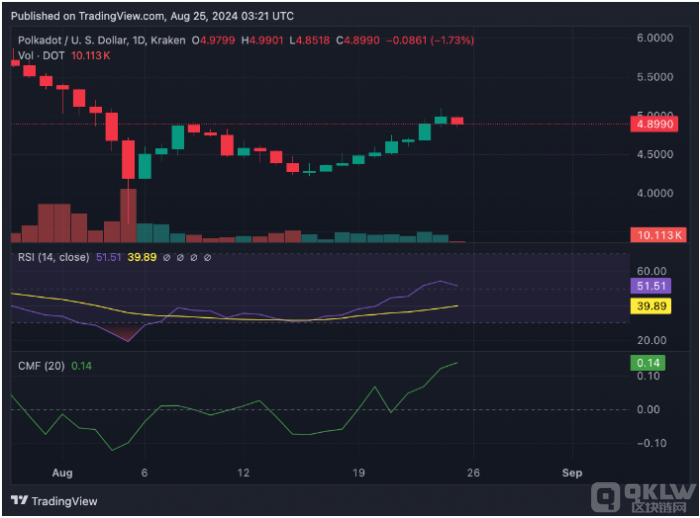 盡管面臨開發活躍度下降的挑戰,DOT 的價格在上周仍上漲超過 11%。目前,DOT 的交易價格為 4.89 美元,市值超過 68 億美元,暫時位列第20大crypto。如果價格無法持續上漲,隨時可能跌出前20名。
