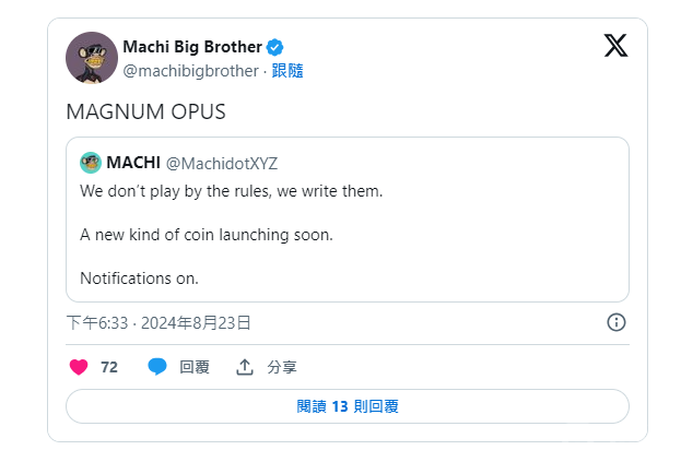 黃立成在crypto和NFT領域早已是知名人物。今年3月,他在Solana網絡上推出了迷因幣$Bobaoppa,成功吸引了廣泛關注。此次,他選擇在Blast鏈上發行新幣$MACHI,顯示出他對不同Blockchain網絡的深厚興趣和不斷探索的精神。