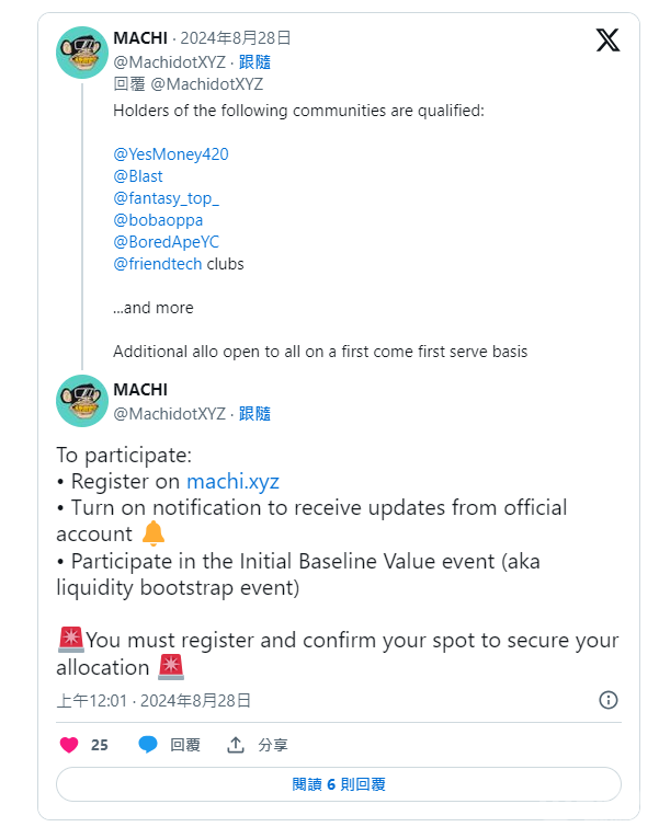 盡管Tokens的詳細發行機制尚未完全公布,$MACHI官方表示,持有YES、Blast、Fantasy.Top、Bobaoppa、BAYC、friend.tech等社群的用戶將有資格獲得初始Tokens分配。想參與的用戶需在官網注冊,并關注官方公告以獲取最新信息,參與下周的初始基線值(Initial Baseline Value)活動,即所謂的流動性引導活動。