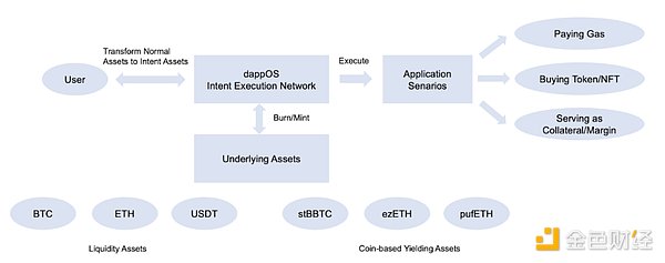 意圖資產:dappOS體系內的通用資產,可以將一系列等價資產在體系內做同質化處理,同時可以兼顧資產的生息屬性和交易屬性。