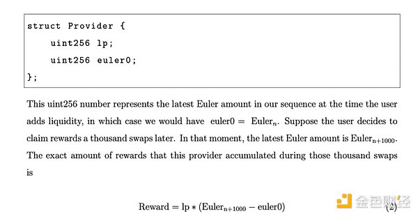 Ethervista對智能合約維護(hù)著一個稱為Euler金額的升序數(shù)字序列。每次將原生ETH轉(zhuǎn)入對智能合約時,這些值都會更新。每個Euler金額都是通過將前一個Euler金額加上費(fèi)用與當(dāng)前流動性提供者Tokens(LP)總供應(yīng)量的比率來確定的。初始Euler金額設(shè)置為零。