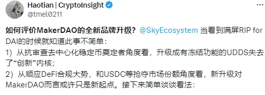 以 MakerDAO 為例,其更名為 Sky Protocol 的決定背后有著深刻的戰略考量。加密研究員 Haotian 指出,對于像 MakerDAO 這樣的老牌 DeFi 項目,監管合規問題是繞不開的挑戰。尤其是在市場擴展的過程中,迎合監管要求幾乎是不可避免的。而此次更名,可能是 MakerDAO 為適應監管環境、拓展市場所作出的第一步。