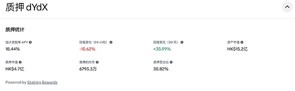 在dYdX的估值分析中,存在著較明顯的估值溢價(jià)情況,主要原因在于質(zhì)押導(dǎo)致的有限流動(dòng)性供應(yīng)。DYDX作為dYdX鏈的L1Tokens,既用于手續(xù)費(fèi)支付,又用于驗(yàn)證者質(zhì)押以保證鏈上安全。目前,整個(gè)權(quán)益證明(PoS)網(wǎng)絡(luò)的平均質(zhì)押率為52.4%,參考Polygon、Solana等現(xiàn)有公鏈長期質(zhì)押率在40%~70%之間,dYdX鏈的質(zhì)押率極可能超過40%。